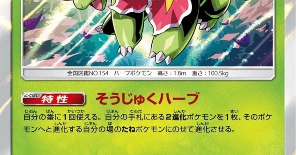 メガニウムより素早い炎ポケモンは絶対有利ですね。 [ じしん ]を一回くらったとしてもすぐ[ かえんほうしゃ ]の2回目で倒せます。 相手が[ ひかりのかべ ]を貼ってもすでに先制の効果抜群の一撃が決まっているのでHPは激減しているはず。. ポケモン金銀の御三家「チコリータ」。 チコリータを選ぶと序盤のジムが辛く、他のポケモンに頼ることになる。 また、最終進化のメガニウムも無駄に割り振られた種族値によってあまり活躍は見込めないポケモンとなっている。 そんなチコリータ(メガニウム)に関する話題をまとめてみた。. 特性 「そうじゅくハーブ」 によって、 手札の2進化ポケモンを場のたねポケモンからいきなり進化させることができます 。 チャンピオンズリーグ新潟でも大注目されたカードなので、このデッキでも採用してみました♪.
